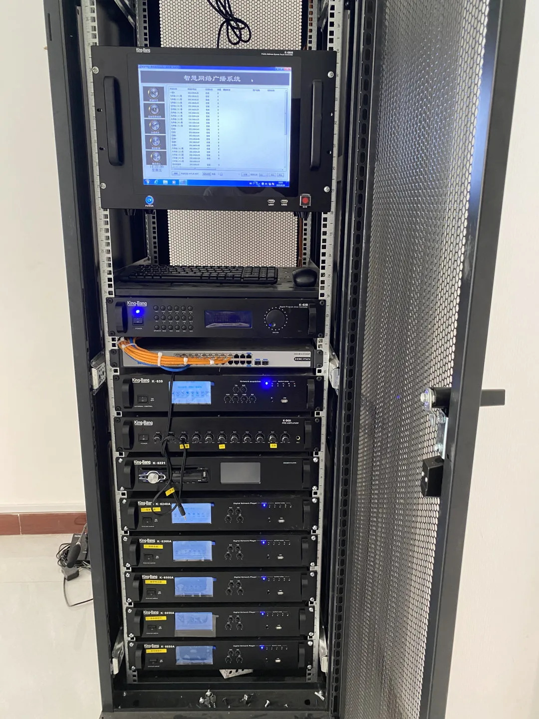 京邦電子(KING-BANG)干凈利落的機柜排列,實現(xiàn)設(shè)備的集中管理,更方便操控各類器材,更輕松進行管理和精確的控制。讓客戶通過簡單的操作,實現(xiàn)對各類系統(tǒng)設(shè)備的實時控制,輕松達到預(yù)想效果。