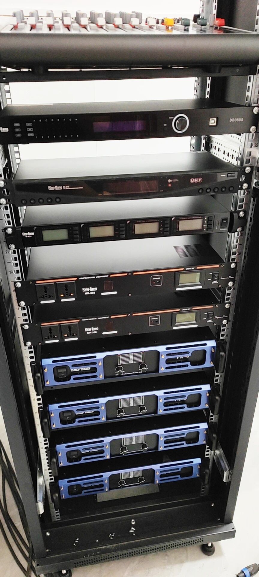 根據(jù)用戶需求,配置單8寸會議全頻音箱,高低音雙分頻設計,穿透力強,不管是音樂還是人聲都能表達出聲音的細膩之處;8進8出數(shù)字音頻處理器,內置反饋抑制、自動混音、矩陣混音、均衡器、分頻器、壓縮器、AEC(回聲消除)、ANC(噪聲消除)等DSP功能;一拖二真分集無線麥克風,采用真分集接收技術,空闊最大使用距離300米,適用于大小舞臺,會議廳等;一拖四無線麥克風,具先進的數(shù)字ID導頻功能,徹底杜絕干擾和竄頻現(xiàn)象,可任意選配手咪、頭戴、領夾、鵝頸;電源時序器,大功率線路,滿足較大功率用電系統(tǒng)使用,芯片控制,使電路更加穩(wěn)定可靠;雙通道專業(yè)功放,完善的保護電路,多熱保護,短路保護,直流保護,射頻干擾濾波保護。