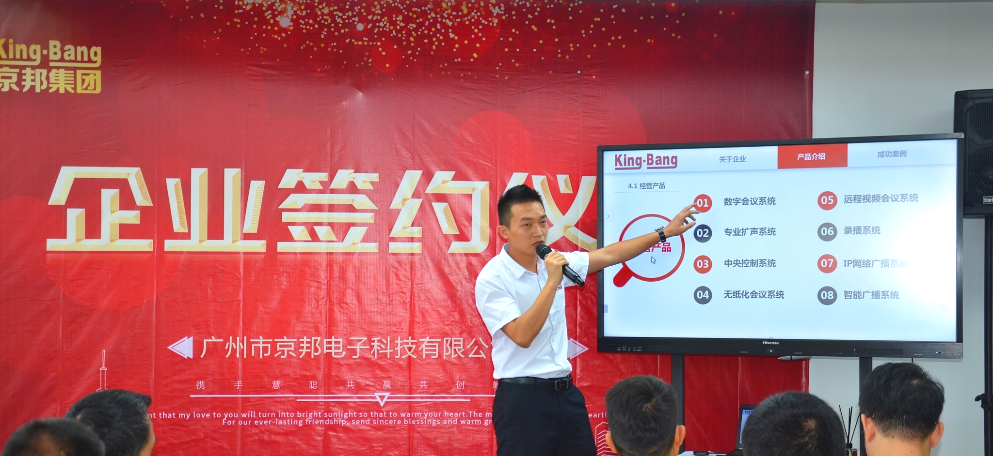 京邦電子(KING-BANG)本次活動為慧聰網(wǎng)買家團帶來了全新的會議系統(tǒng)、網(wǎng)絡廣播系統(tǒng)、智能交互式無紙化會議系統(tǒng)、分布式多媒體中控矩陣系統(tǒng)及專業(yè)擴聲等多個系統(tǒng)應用,以“為客戶創(chuàng)造價值,為客戶解決問題,至誠服務客戶“出發(fā),為行業(yè)帶來領先的音視頻整體解決方案和服務模式。